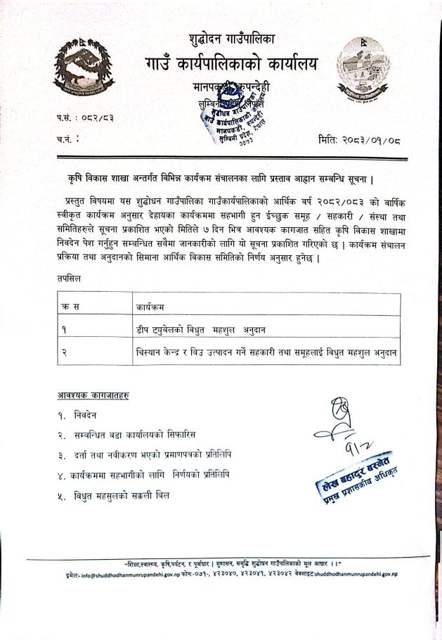 कृषी विकास शाखा अन्तर्गत विभिन्न कार्यक्रम सन्चालनका लागि प्रस्ताव आव्हान सम्बन्धि सूचना।