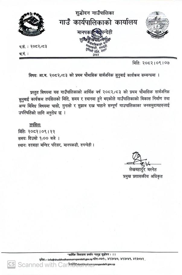 आ.व. २०८२/०८३ को प्रथम चौमासिक सार्वजनिक सुनवाई कार्यक्रम सम्बन्धी सूचना ।
