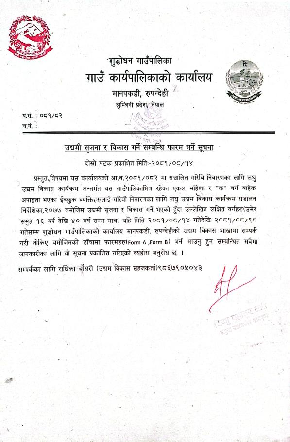 उधमी सृजना र विकास गर्ने सम्बन्धी फारम भर्ने सूचना।