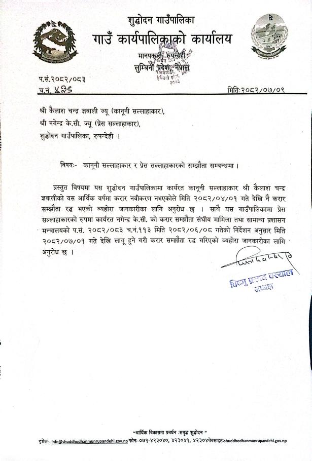 कानुनी सल्लाहाकार र प्रेस सल्लाहाकारको सम्झौता रद्ध सम्बन्धमा।