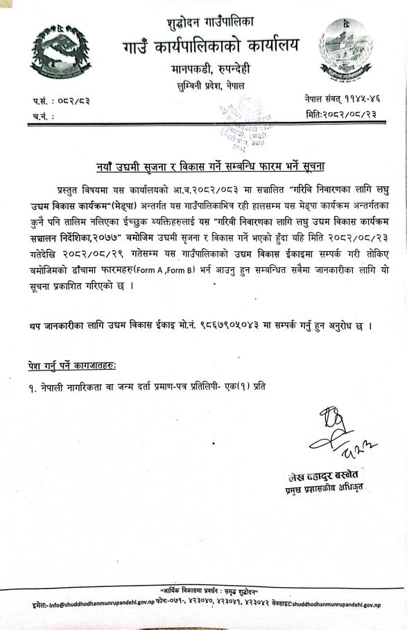 नयाँ उधमी सृजना र विकास गर्ने सम्बन्धी फारम भर्ने सूचना।