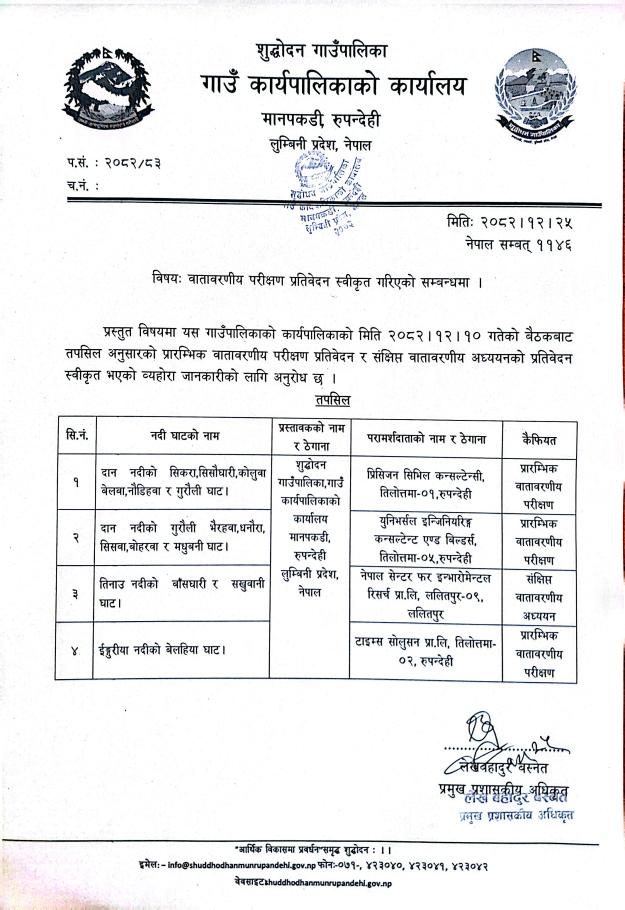 वातावरणीय परिक्षण प्रतिवेदन स्वीकृत गरिएको सम्बन्धमा।